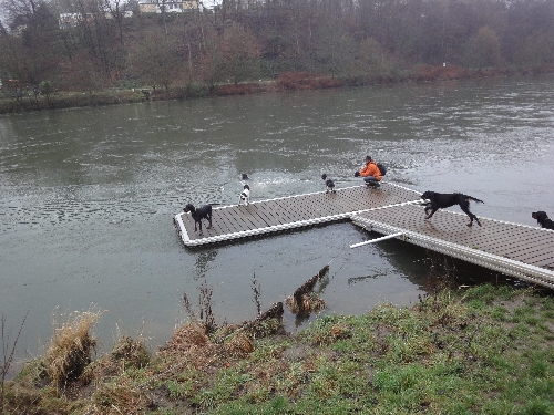 In der Nähe der Henrichshütte in Hattingen trafen sich die RheinRuhrSetter zur letzten Aktion im Jahr 2011, dem Silvesterspaziergang. Durch den vielen Regen in den letzten Tagen waren wir bereits auf schlammige Bodenverhältnisse vorbereitet. "Quoten-Cocker" Rudi wurde diesmal wieder untersützt von den beiden Cocker-Youngsters Da Vinci und Dakar. Es zeigte sich, dass sie genauso wasserverrückt sind wie unsere Setter. Sie folgten Katrin und Christian begeistert zum Anleger und gingen auch ein Ründchen baden.