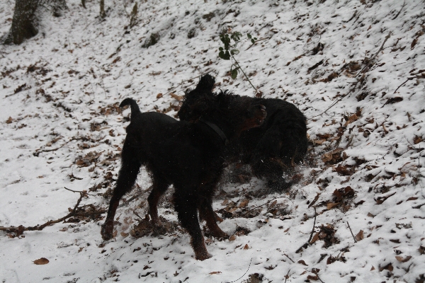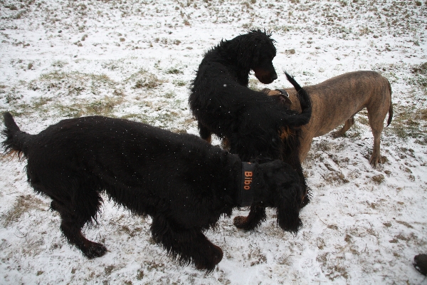 Und dann kamwa zu zwei Tölen ... watt war dat denn? Scottish Terrier sachte dat Frauchen, ein Erwachsener und ein Furzknoten (12 Wochen). Aha, sind wa wieda schlauer. Fanden unsere Setter irgendwie knorke die beiden Struppis :o)