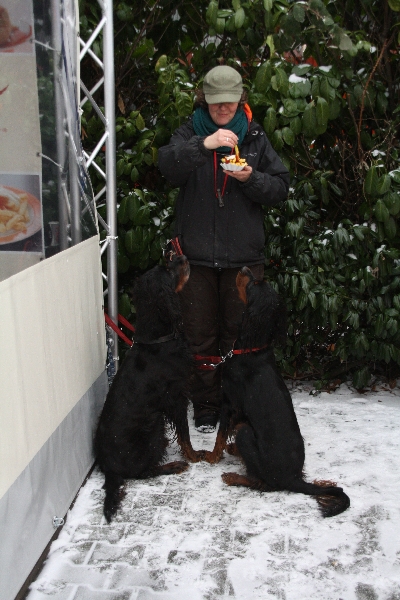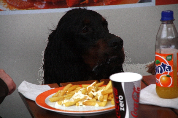 Honey versuchte alles, um anne Pommes zu kommen. Abba bei Herrchen Dieter war nix zu machen.